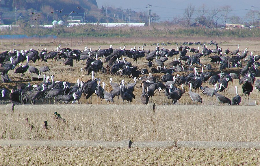 なべづる(鍋鶴)【つる科】 下は九州の出水での集団画像 手前には青鴨がいる