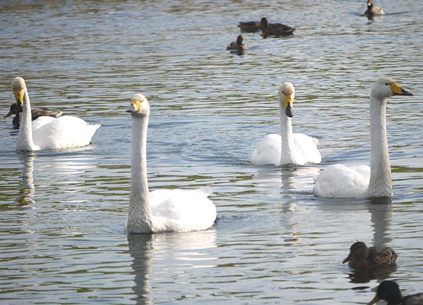 冬に湖や湖沼、大きな川、河口に集団で渡来する大型の渡り鳥