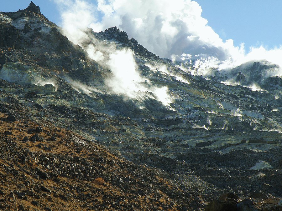 三俣山への登山道からの展望 蒸気や硫黄、亜硫酸ガス等が噴気しており危険で荒々しい