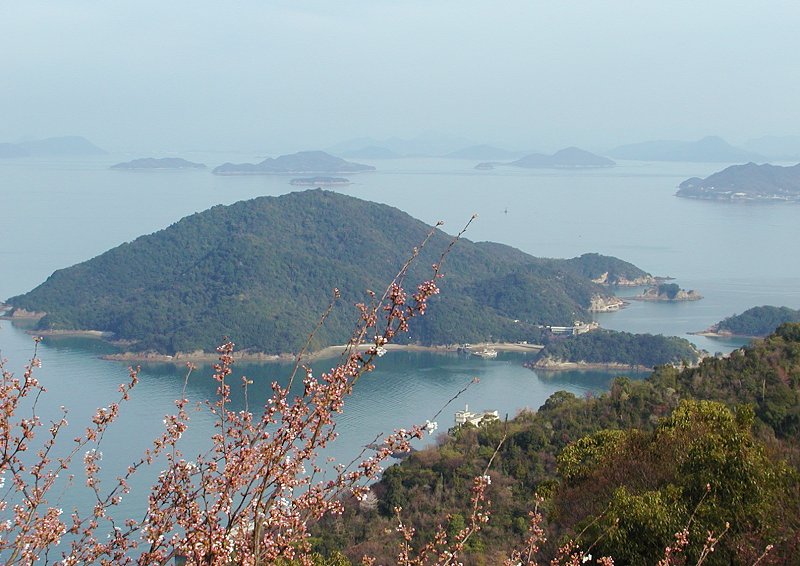 春霞の海に島々が浮かんでいる 桜も咲き始めた 遠くは笠岡諸島 四国は右端
