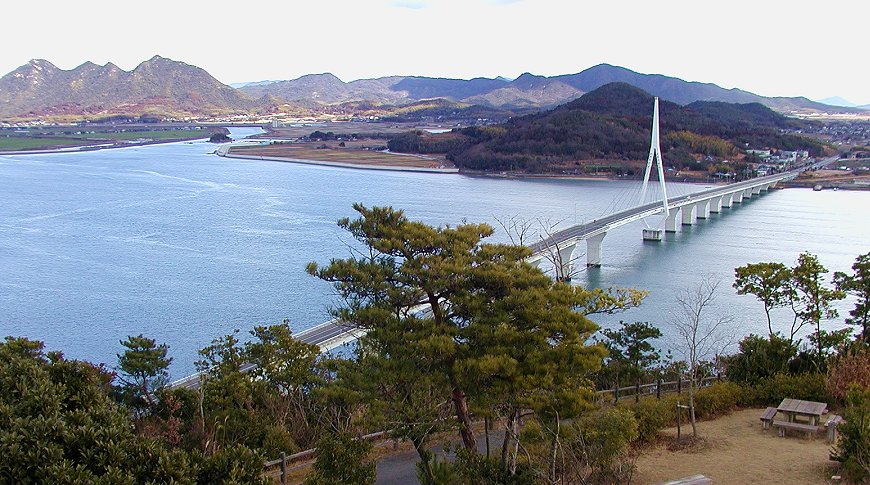 。周防大橋の中央尖塔の左が朝日山で右が秋穂町だ。
