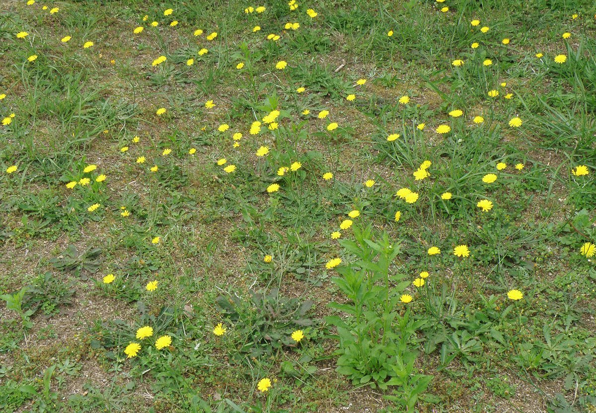 草原に咲いたブタナ 伸び伸びと育って、輝くライトグリーンの中で黄色の花を咲かせている