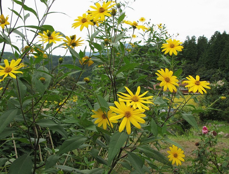 民家の庭に生えて草丈は3m位になり、見上げて花を見る感じだ