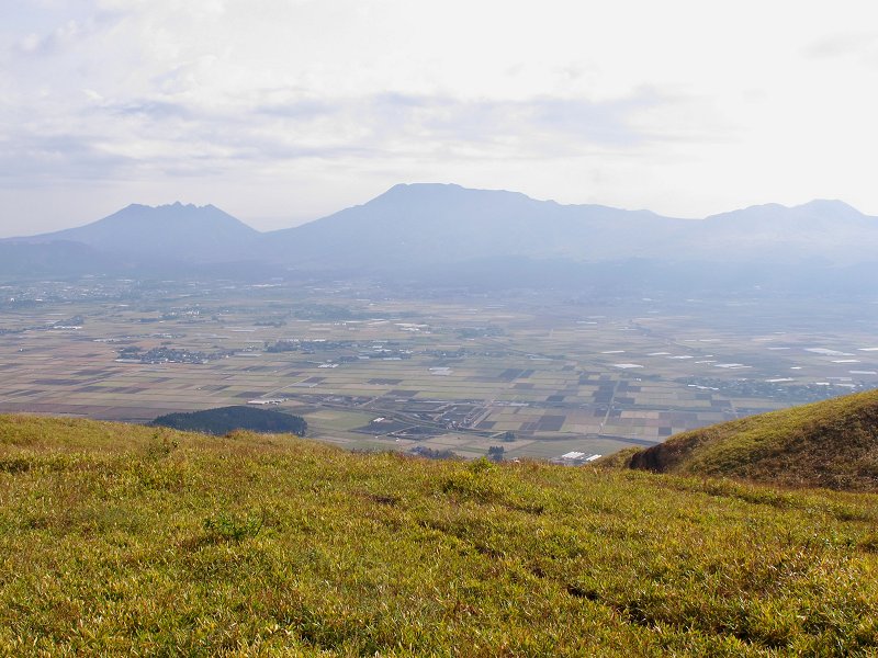 大観峰より阿蘇盆地をはさみ阿蘇五山を見る 秋のモヤに包まれている