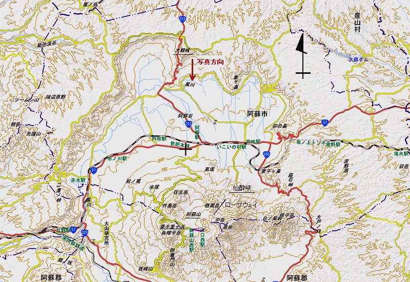 画像の上にマウスポイントを乗せるとモヤが濃い別の画像に変わる 下に阿蘇の地図あり