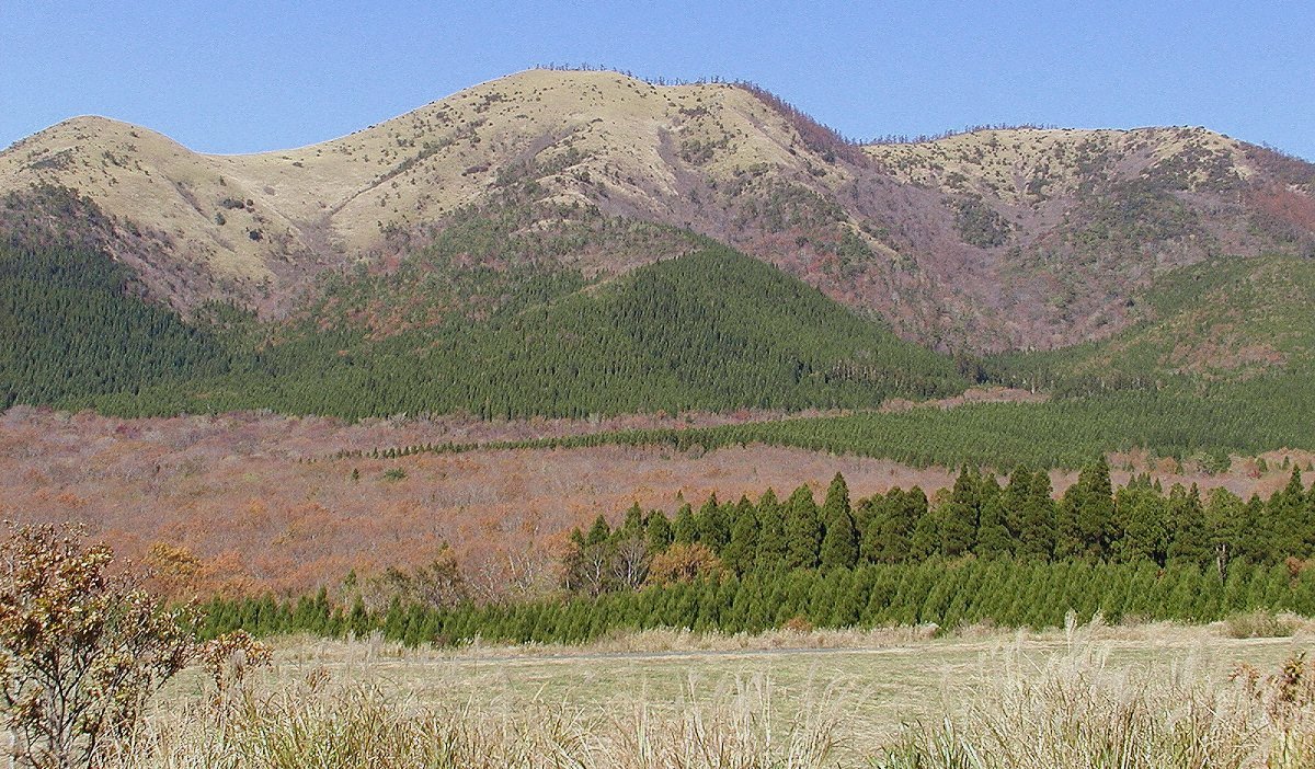2004.11 山の麓は杉や桧の針葉樹林でまた椎茸を栽培する原木のクヌギ等の落葉樹が赤い葉を見せている