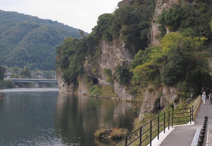 右下の人が歩いている車道の川側に下った所にある穴がその洞門と道 菊池寛 ”恩讐の彼方”の小説で有名だ
