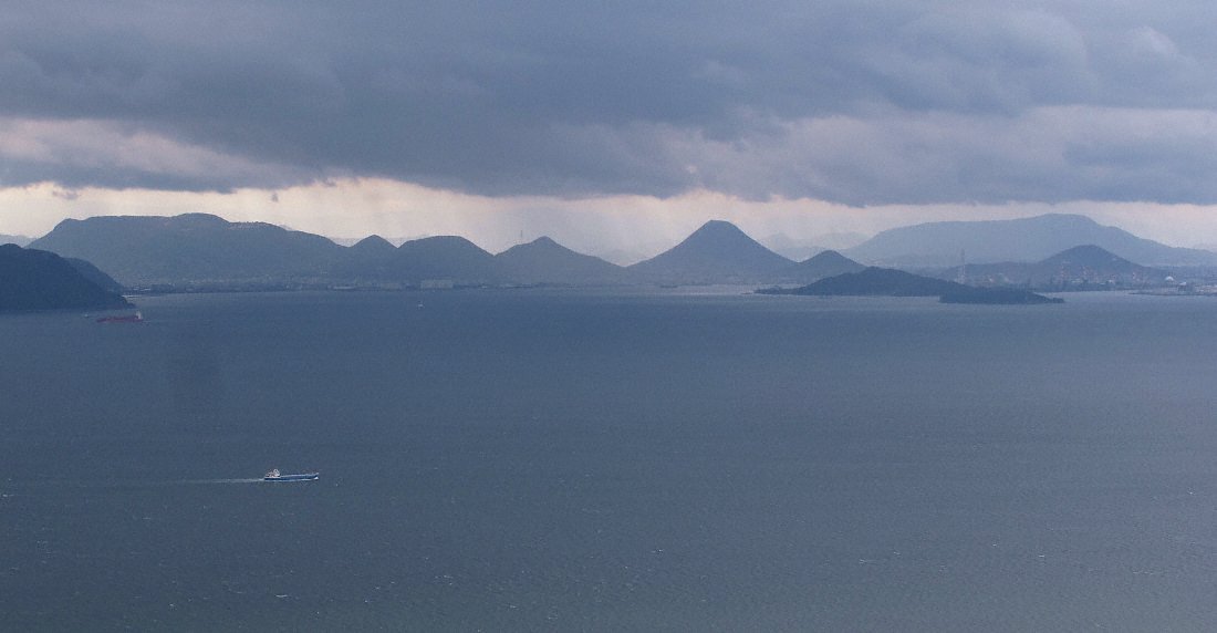 瀬戸中央自動車道路の四国側 左端は白峰寺や根香寺がある五色台 中央の街は坂出市 コニーデ型の山は讃岐富士 右端が橋の先端