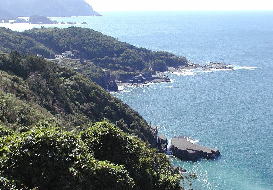 付近は人も住まない荒々しい岩の海岸だ 景色は雄大 家が見えるが観光の施設 遠くには須佐湾が見える