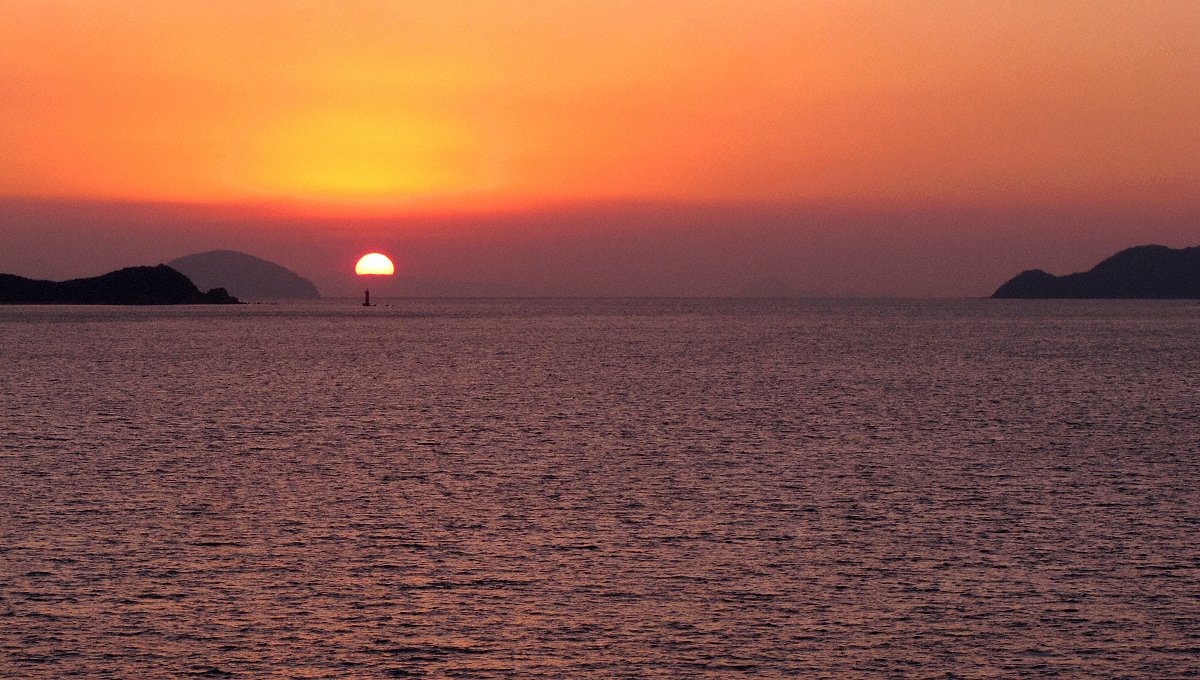 山口県東南部の瀬戸内海に突き出た室津半島から見た周防灘の入日 太陽の下が九州の国東半島 この辺りは舟釣りのメッカ