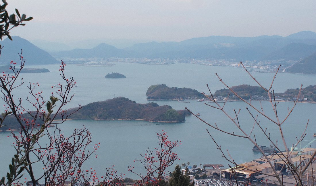 穏やかな瀬戸内海で浮かんだ島々が見える