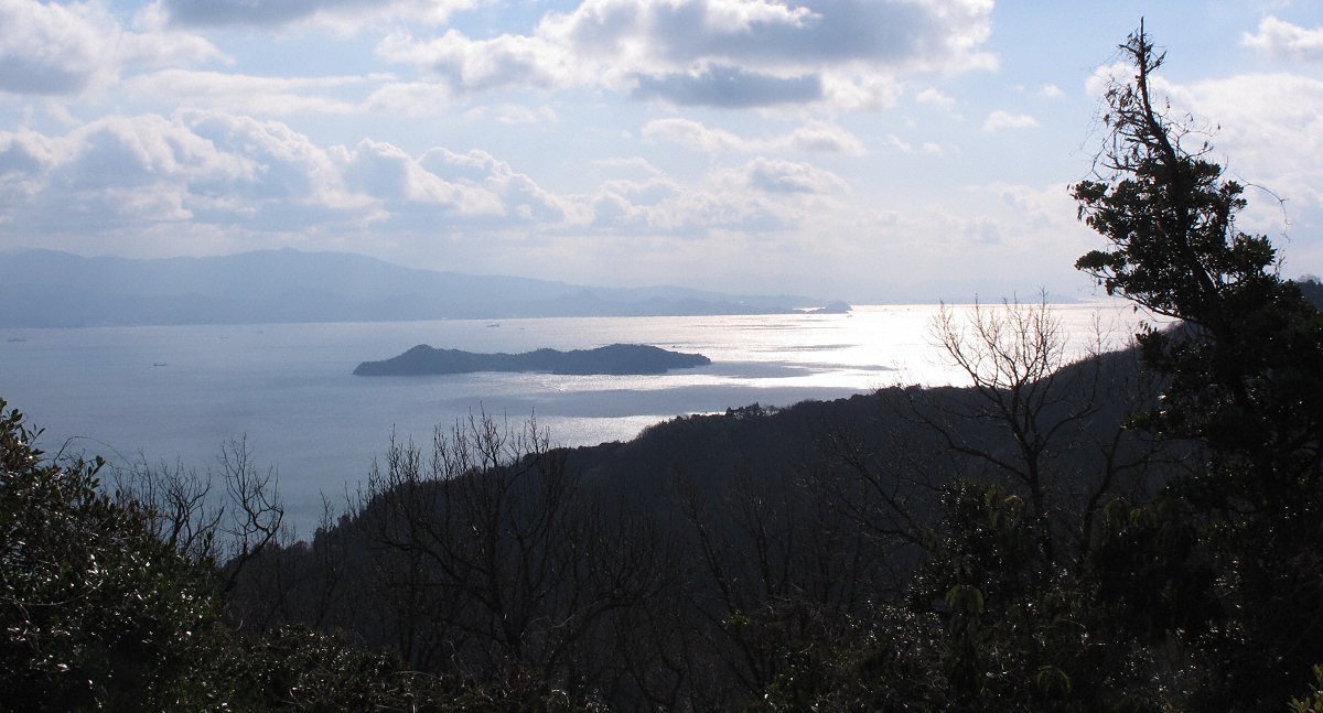 南方面を見ており対岸は四国の松山で近い 海は響灘で行きかう船は多い 間の島は豊島町の斎島