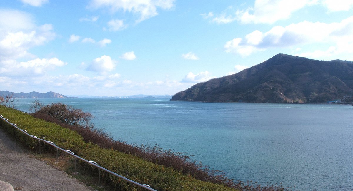 左の本土との間には遠く見える蜜柑栽培で有名な大崎上島があり、近くの長島にある火力発電所の白い煙突も見える 大崎上島には渡る橋が無い