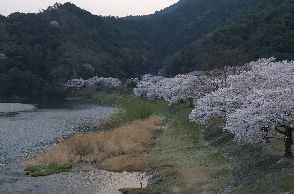 橋より錦川の下流を見ている 堤防敷きに植えられた日が暮れゆく頃の染井吉野桜 川沿いの柳は芽吹いている
