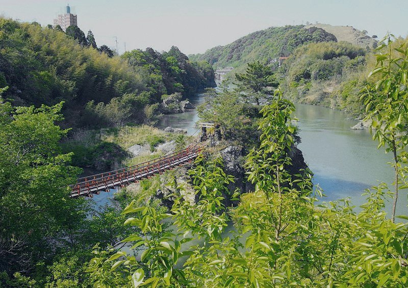 温泉より南の物部川の景観を見る 島がありここから渡れる