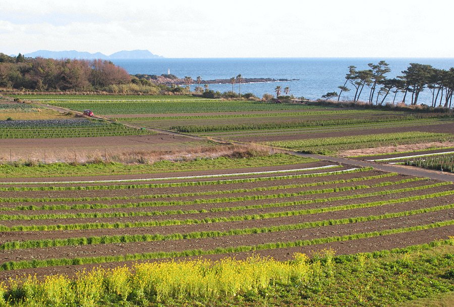 長崎鼻は売店や食堂、またガーデンがあり賑わう 手前の海辺の畠は寒い時期でも露地で花や野菜が栽培されている