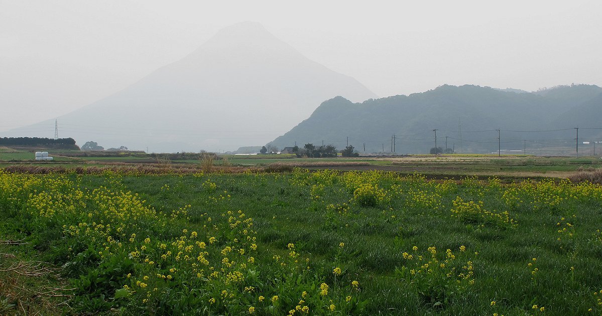 2015.2 開聞岳は霞んでボーとしか見えない 2月、ここでは菜の花の盛り 田に落ちたこぼれ種で咲いた菜の花