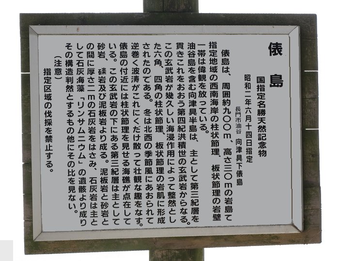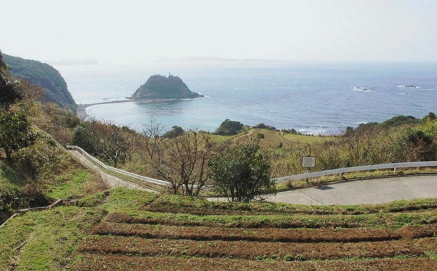 島には奇岩がある 遠くかすむのは角島 周りは棚田が多くて車で走っていても見飽きない風景である