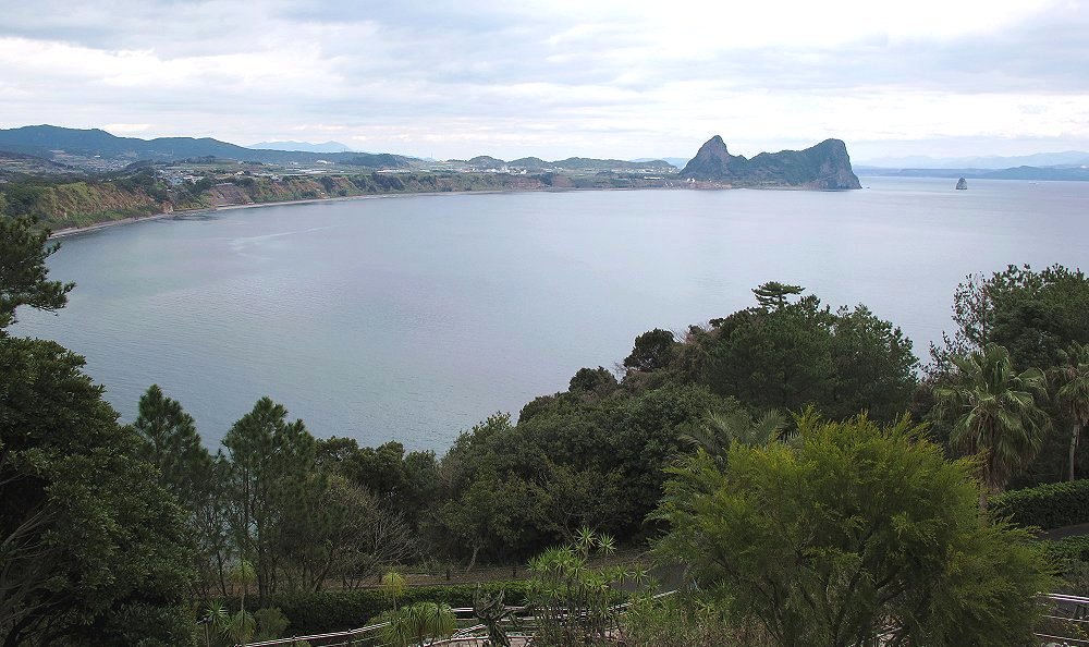 その左奥が指宿の街と温泉 左の山の上に遠く山が見えるが桜島 右端には大隅半島が見える