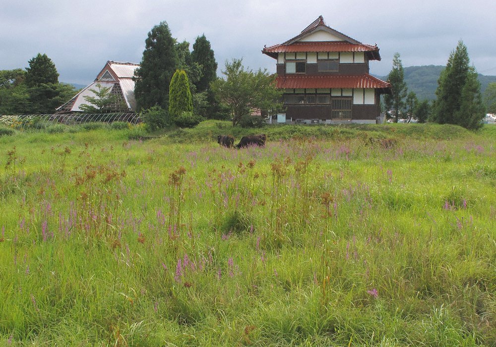 屋根の鉄板が剥げかかった藁屋も年月を感じさせてくれる 茶色の立ち上がった花はアブラガヤ 放牧された和牛が3匹