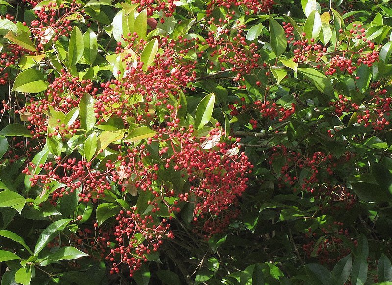 海そばの山に生えていて見事な赤い実と緑の葉が美しかった