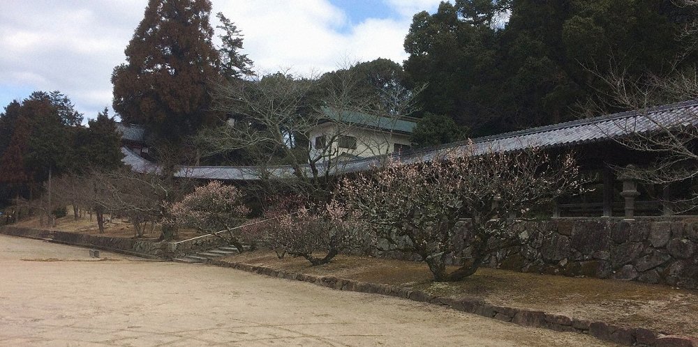 長い回廊を登ると本殿 周りは広々とした田園で民家も多い 早春で梅が咲いている