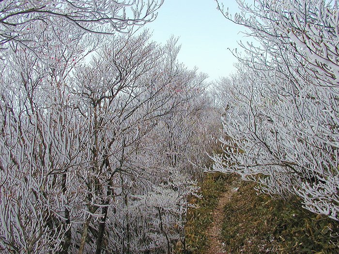 2004.4.28 西赤石山の尾根に咲く曙躑躅に霧氷