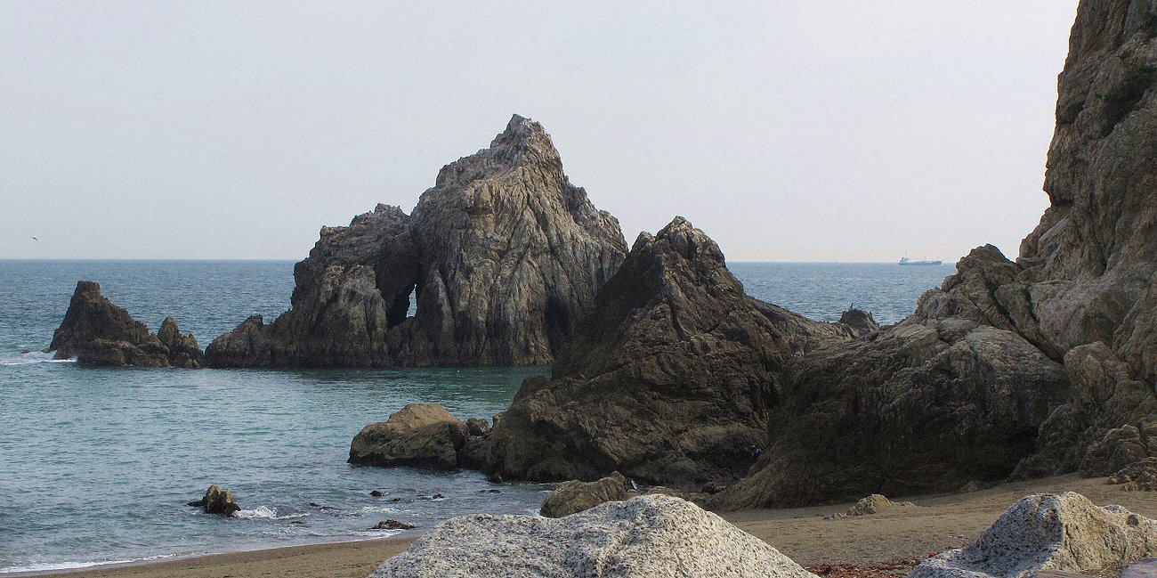石門は波によるのか穴がいくつも明いている それと最近思うのだが、この画像の前の岩を良く見ていると顔を長く伏せた龍の顔に見えてきて不思議