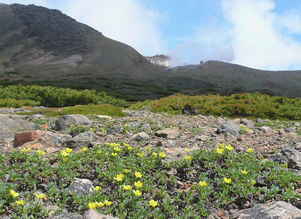 7〜8月、高山の礫地に生える 背後は雌阿寒岳