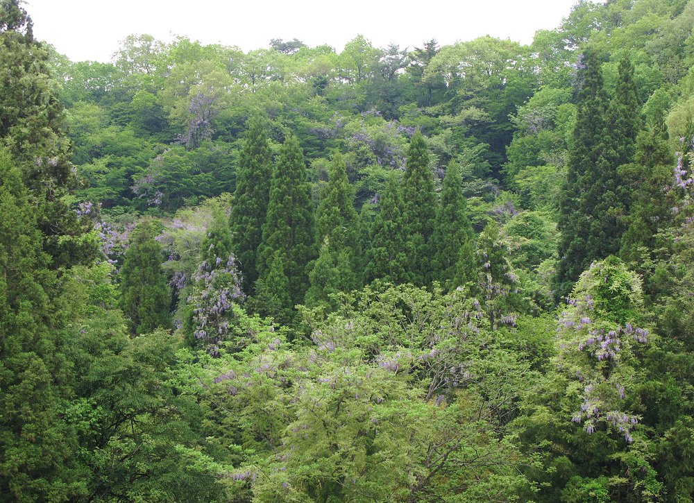 杉の木に登って咲いた藤 丁度里山は田植えが済んだ時期 梅雨前で緑一杯