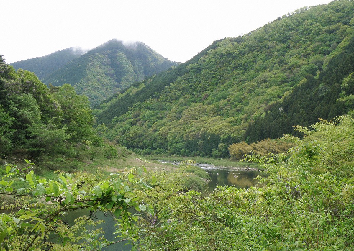 まわりは山に囲まれていて谷からは清水が湧き、それらが流れ出して川となっている 川の傍が平地の部分は市街地もある この時期は藤が咲く