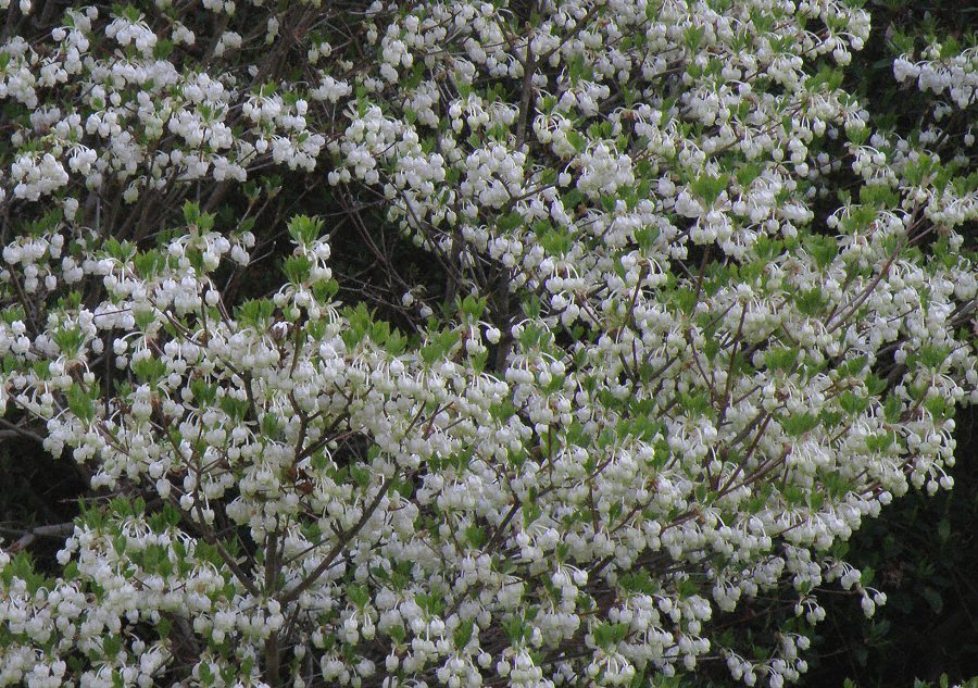 4月に咲く白い釣鐘状(壺状)の小さい木の花