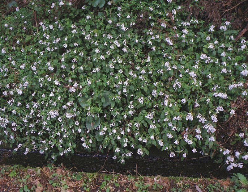 こちらが道で先に側溝がありその山側に群れて咲いていた わりに暖かい山に咲く白い花