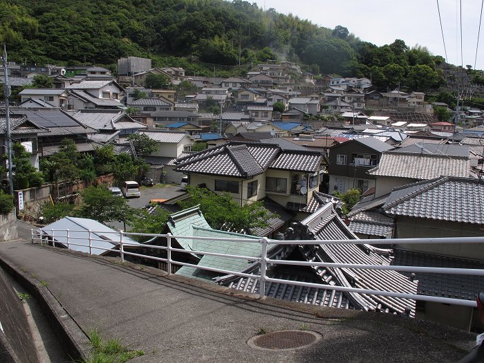 橋を渡った岬の先の坂町付近の風景 名前の通り斜面に発達した町 右の先は海だ ここから先の海岸線は海と山が接しており急な市街地ばかり 先には呉市がある 国土地理院の地図を見る(地理院の地図では海田湾は消滅して広島湾になっている。) |