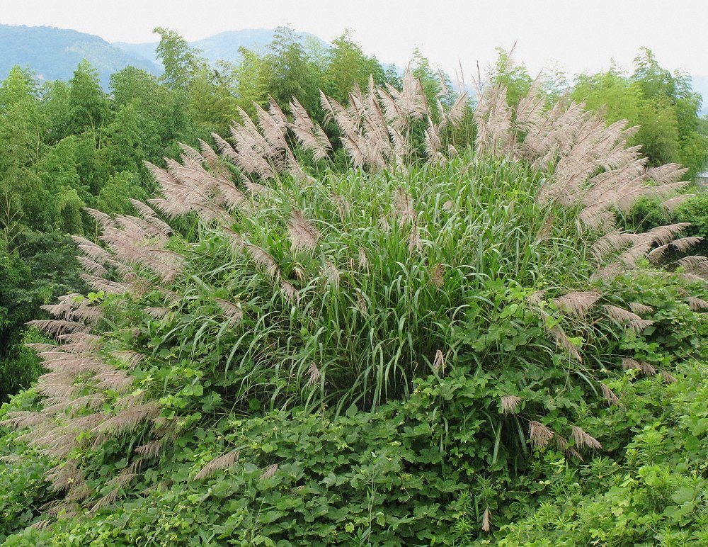 7月の初めに写す 一面緑の中に大型の薄い肌色をしたススキの穂がずらりと半円形に出ている