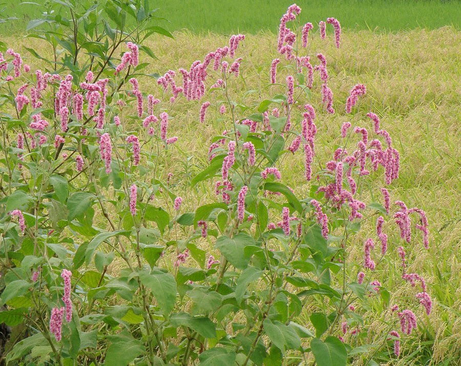 2018.9 刈入れも近い稲田をバックにピンクの花が綺麗であった