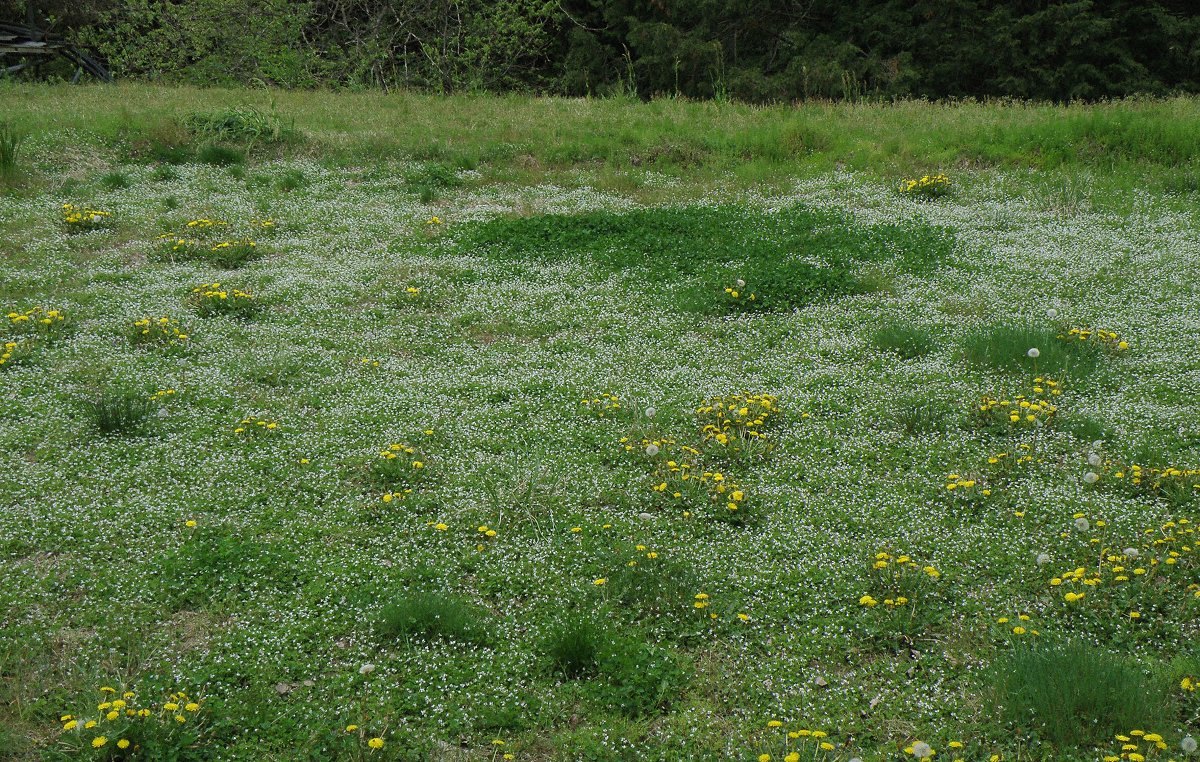 4月の下旬に、山里の耕作されない田に群れて咲いていた。花は真っ白に見えるが中心は赤紫の模様あり