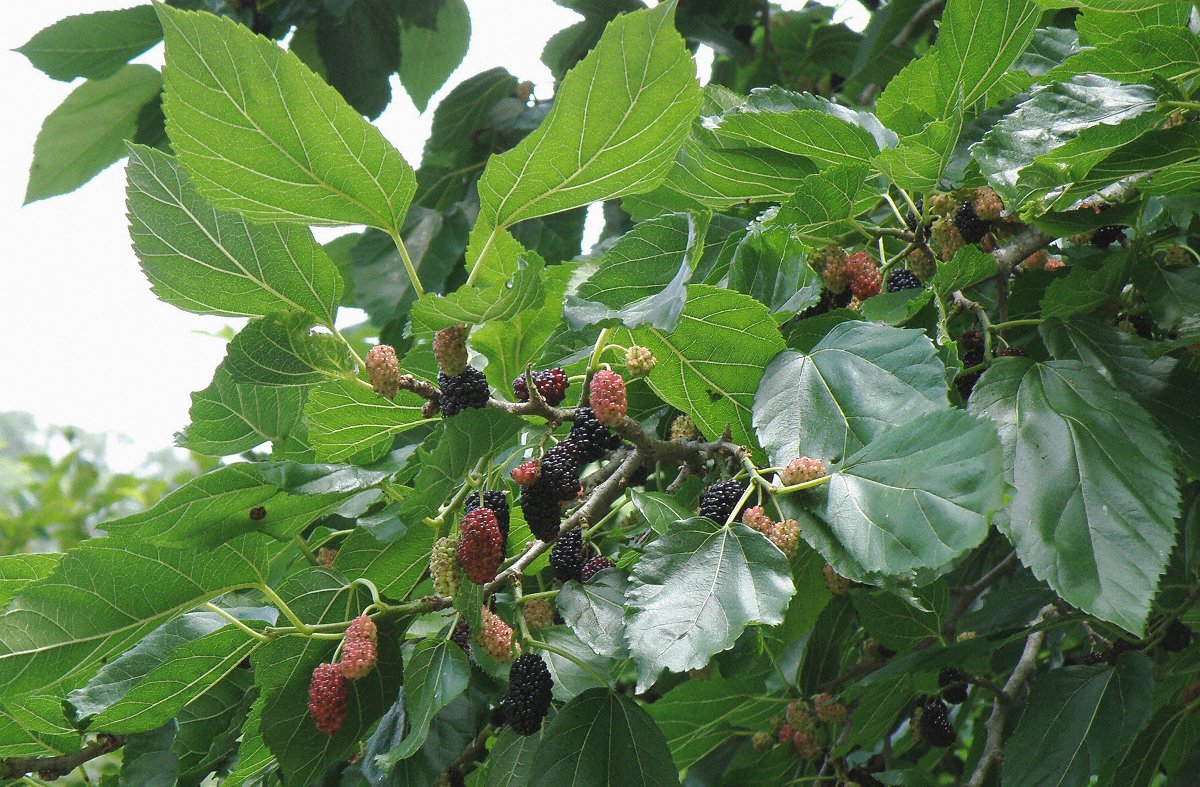 黒い実は食べ頃で甘い 子供の頃はよく食べたものだ 画像の実の大きさは実物大 山桑の実は少し小さくて野鳥の餌である