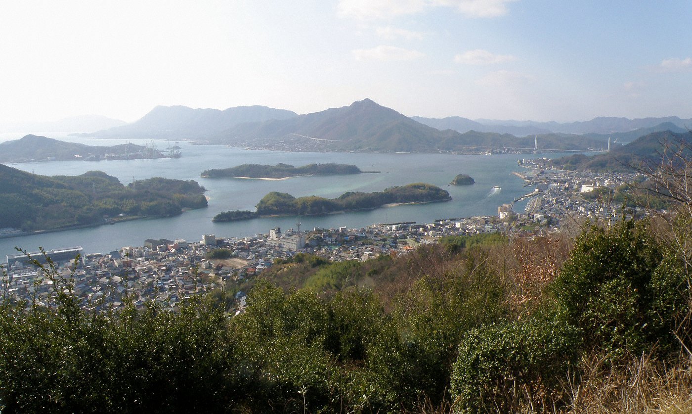 手前の海岸周りには因島の市街地が見える。右には白い色のしまなみ海道の生口橋が見える。渡った島は生口島でここも広島県である。その先はもう愛媛県。