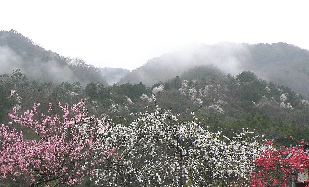 の花 霧雨が舞い山には白い雲がかっている 春雨らしい感じ