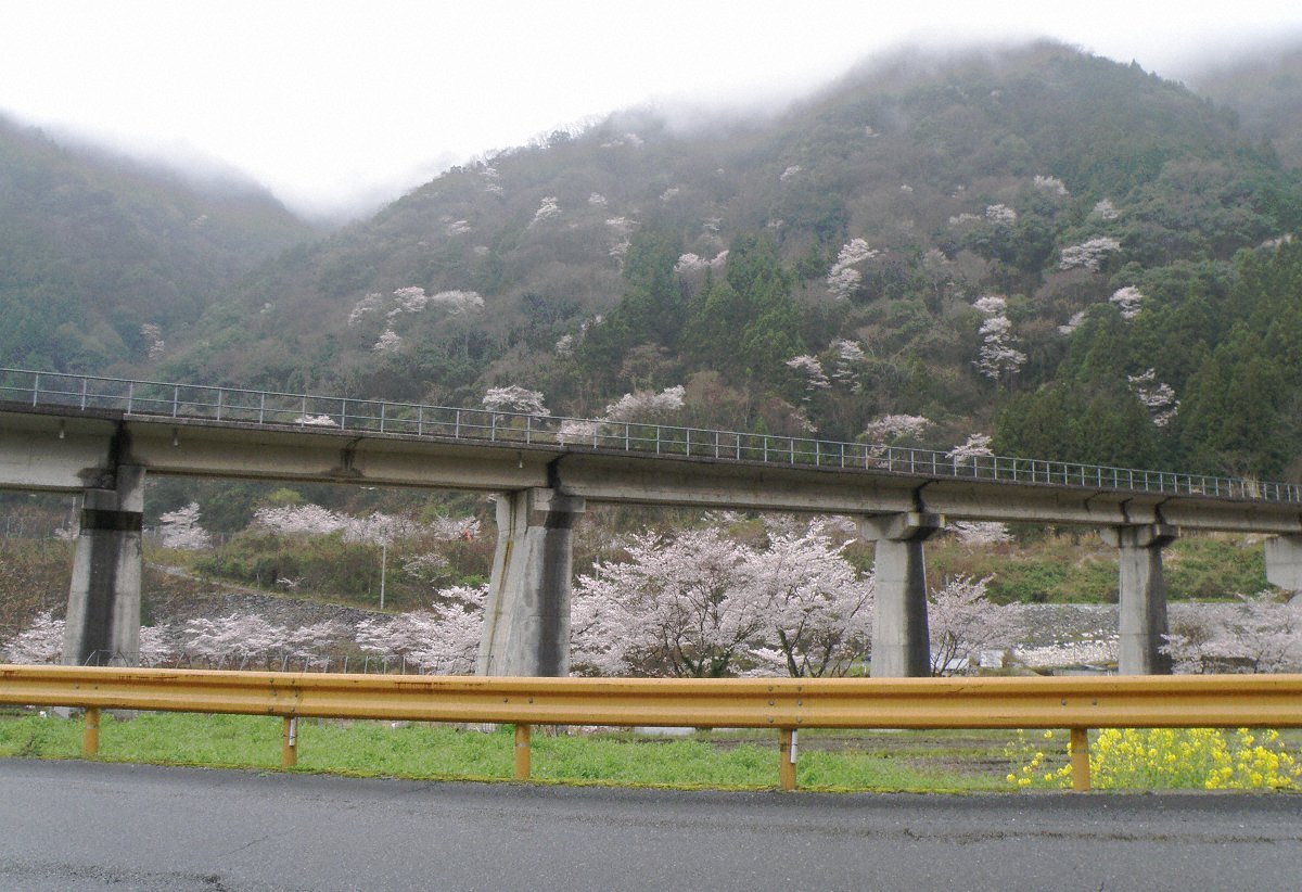 川は堤防の吉野桜の下にあり見えない 手前の道路は国道434号線で、まだ広島までの山間部の一部は改良工事中である
