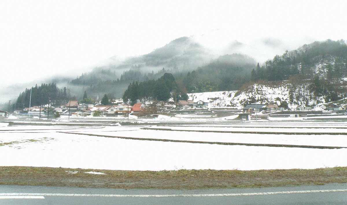 2021.1.23 雪は田を真っ白にして、また霧は山に流れている。小さい雨も降っている。