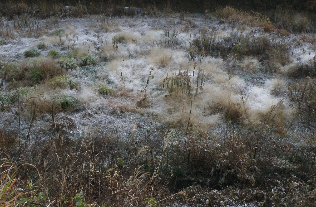 2021.12 本格的な冬になり、耕作を放棄された荒田の雑草に真っ白な霜がおりた。自然がおりなす微妙な風景。