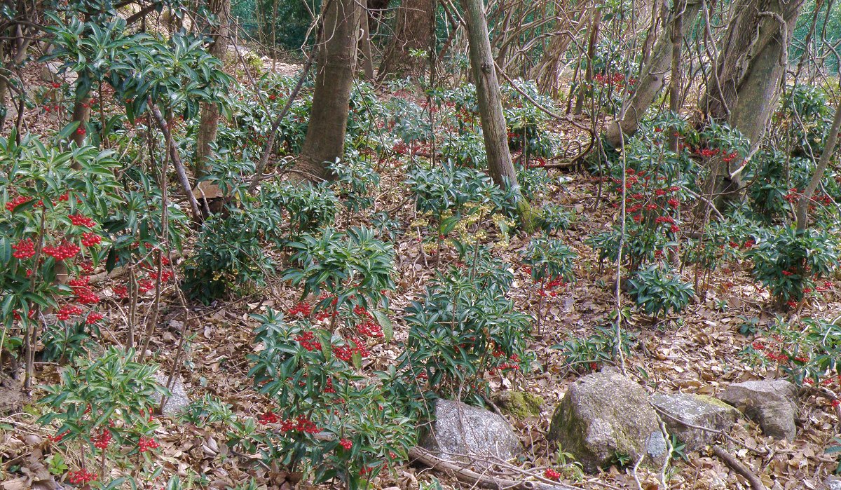 栽培した感じである。正月などに生け花として活用されていたのであろう。もっと茂みが拡がれば見事になりそう。