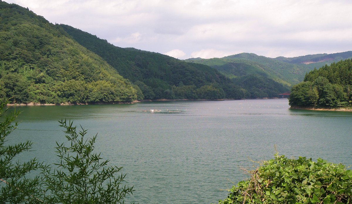 2024.8. ダム管理事務所横よりダム湖を見る 右側の岬のひとつ向こう側に中の島公園があり整備されている。