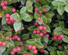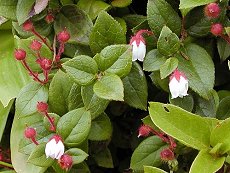 6〜7月咲 釣鐘型の小さな白い花で赤い実を つける 実の大きさ6mm位 果実は食べられる 日当たりの良い高山の斜面に生える 草丈30cm以下 低く匍匐して拡がる 下は花