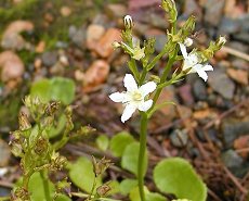 7〜8月咲き 高山の湿った場所に生える 白い5弁の花 葉は丸みを帯びイチョウに似る 花茎を伸ばし先端に集団花を咲か せる 草丈は花茎を除き20cm以内 地下茎でも繁殖し集団を作る