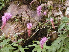 8〜9月咲き 高山に生える 濃いピンク色の花 花名は花が絹糸に似る為 花の長さ8cm程度 根性葉は小葉が11〜13枚ある 蕾は長いピンクのわれもこう 草丈は花茎を入れ90cm以内 斜面に垂れて咲いていた