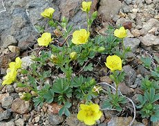 7〜8月頃に咲く 濃い黄色の花で径15mm程度 高山の礫地に生える 地面を這う 小葉は3枚ある 低地の山には葉が苺に似た イワキンバイがある