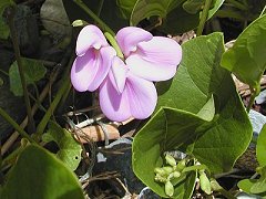 花は6〜9月咲き 浜辺の日当たりの良 い砂地に生える ピンクの花で美しい 花径25mm程度 丸く大きい小葉は3 枚ある 秋になる実は大きく 8cm位ある 種が3ケ位入ってい る